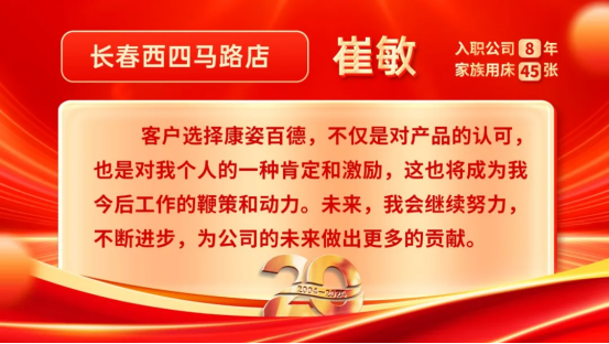 崔敏说道:“后来这位女士和我反馈说,孩子睡着特别好,对这款学生床垫也是赞不绝口。更令我欣慰的是,客户表示下次有需要还会找我。这样的反馈对我来说比吃了蜜还甜,因为它不仅是对球盟会(中国)产品的认可,也是对我个人的一种肯定和激励,这也将成为我今后工作的鞭策和动力。未来,我会继续努力,不断进步,为公司的未来做出更多的贡献。”