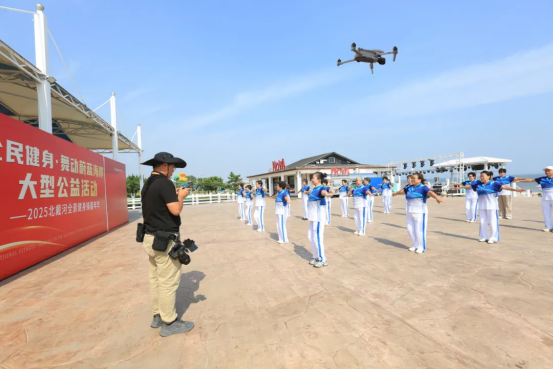 为确保完美呈现全民健身的活力与海岸美景,本次活动首次启用大型摇臂、无人机航拍与专业摄影团队协同作业,全方位、多角度记录健身盛况。景区内大型摇臂一次次平稳升起,将健身场景与海天精准记录;无人机持续在高空盘旋,捕捉整片海岸的健身盛况;经验丰富的专业摄影团队多角度跟拍,不错过每一张灿烂笑脸、每一个有力动作、每一次欢快互动。